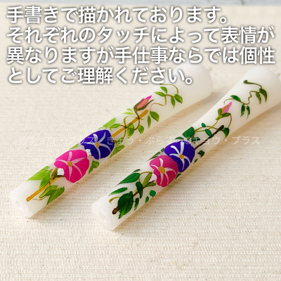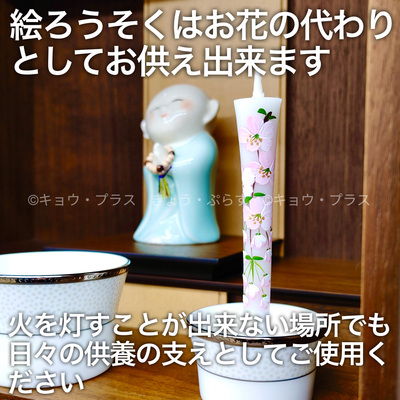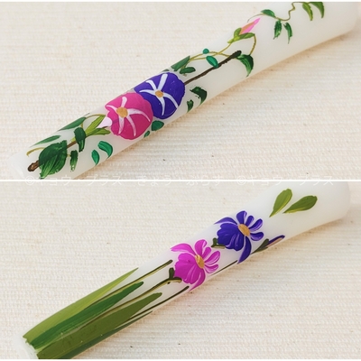 手描きで描かれた花々は温もりのあるタッチで描かれており一つ一つが違う表情を見せてくれています。また、火を灯さずとも燭台にお供えすれば仏壇を鮮やかに彩ってくれます。