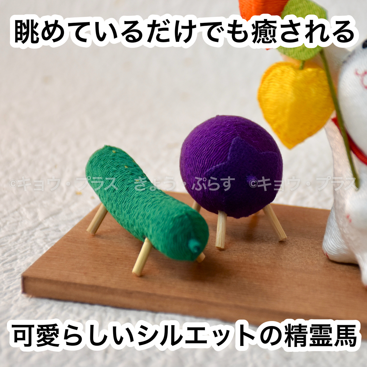 ご先祖様の乗り物としてキュウリとナスで馬と牛を表しています。行きは足の速い馬(きゅうり)で早く来て、帰りは足の遅い牛(ナス)でゆっくり帰ってほしいという願いが込められています。