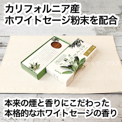 カリフォルニア産ホワイトセージ粉末を配合し、ホワイトセージ本来の煙と香りにこだわったお線香です。お部屋焚きのお香としてもお楽しみいただけることは勿論、短く折れば時間の調整が可能に、複数本まとめて使えば香りと煙をしっかり堪能できるのがお線香ならではの魅力です。